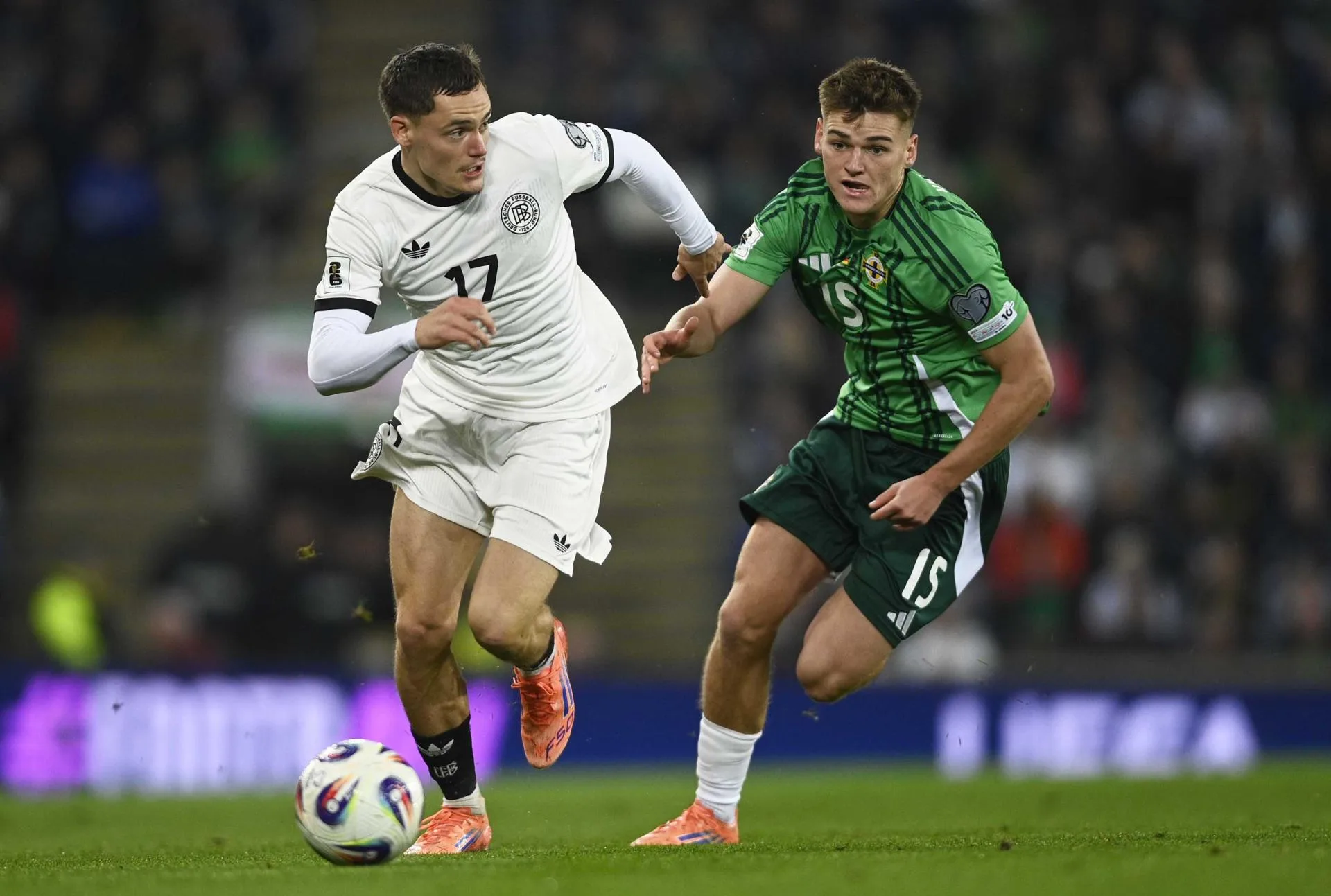 BELFAST (United Kingdom), 13/10/2025.- Justin Devenny (R) of Northern Ireland in action against Florian Wirtz of Germany during the FIFA World Cup 2026 qualification match between Northern Ireland and Germany in Belfast, Northern Ireland, 13 October 2025. (Mundial de Fútbol, Alemania, Irlanda, Reino Unido) EFE/EPA/MARK MARLOW