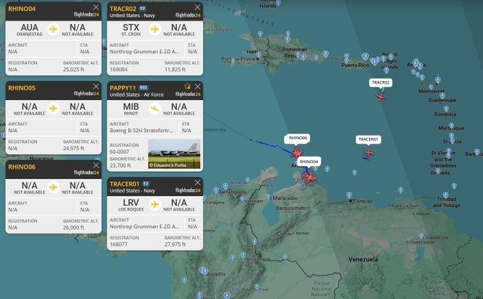 La operación aérea de Estados Unidos en el Caribe escaló su nivel de complejidad táctica este lunes 24 de noviembre, luego de que el bombardero estratégico B-52H (PAPPY11) fuera interceptado en los sistemas de rastreo acompañado por una escolta de combate.