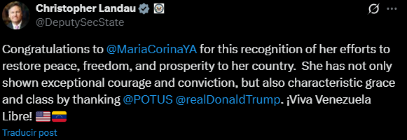 CompartirEl subsecretario de Estado de Estados Unidos, Christopher Landau, se sumó este viernes 10 de octubre a las felicitaciones a María Corina Machado por el Premio Nobel de la Paz y aplaudió el gesto que tuvo la líder de la oposición democrática venezolana de agradecer al presidente Donald Trump. A través de su cuenta en la red social X, Landau felicitó a la laureada por «sus esfuerzos para restaurar la paz, la libertad y la prosperidad en su país», elogiando su «excepcional coraje y convicción». Sin embargo, el punto más destacado de su mensaje fue la afirmación de que Machado mostró su «característica gracia y clase al agradecer a Donald Trump». Al final de su mensaje, Landau escribió: «¡Viva Venezuela libre!». Esta declaración del Departamento de Estado secunda la narrativa del presidente Trump, quien afirmó a periodistas que Machado lo había llamado para decirle que él «realmente merecía» el premio. A petición de nuestra audiencia todos los anuncios publicitarios fueron removidos Navegación de entradas Pietro Parolin espera que el Premio Nobel de la Paz a María Corina Machado ayude a Venezuela María Corina Machado ganó el Premio Nobel de la Paz 2025