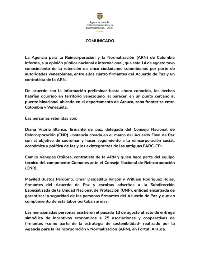 «De acuerdo con la información preliminar hasta ahora conocida, los hechos habrían ocurrido en territorio venezolano, al parecer en un punto cercano al puente binacional ubicado en el departamento de Arauca, zona fronteriza entre Colombia y Venezuela«, señaló la Agencia para la Reincorporación y la Normalización (ARN) en un comunicado.