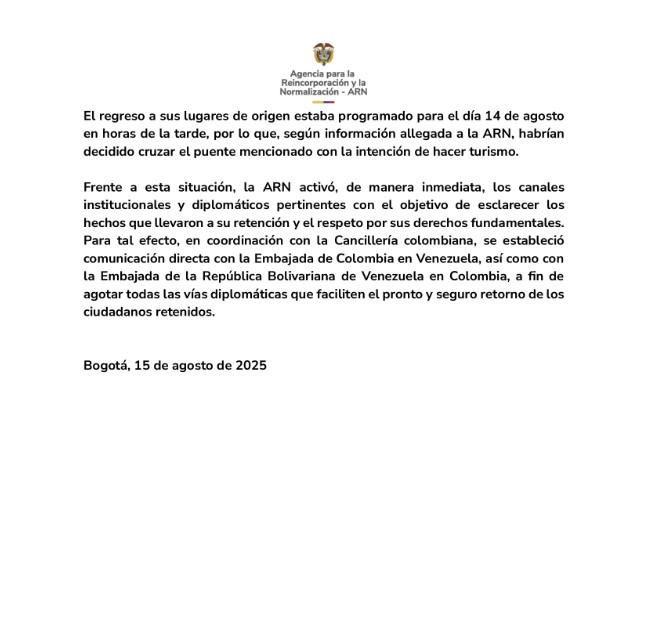 «Frente a esta situación, la ARN activó de manera inmediata los canales institucionales y diplomáticos pertinentes, con el objetivo de esclarecer los hechos que llevaron a su retención y garantizar el respeto por sus derechos fundamentales«, señaló esa entidad.