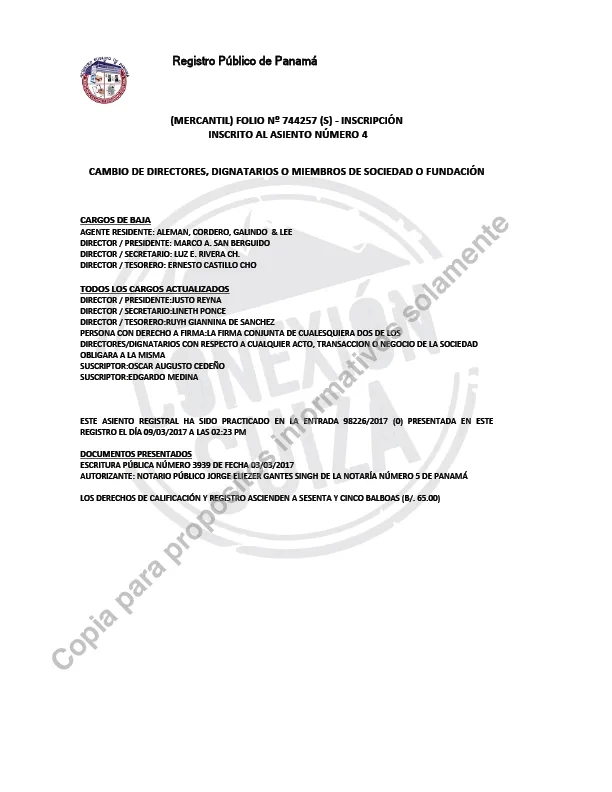 Craft Financial S. A. está en opencorporates.com como una empresa registrada en Panamá el 12 de agosto de 2011, apenas mes y medio antes de que se enviara el primer memorando de la CBH. Documentos oficiales confirman esta información y señalan que la compañía se abrió con un capital de 10.000 dólares americanos. El nombre de Díazgranados no aparece por ninguna parte, ni al momento del registro (cuando suscribieron Marco A. San Berguido, Luz E. Rivera y Ernesto Castillo Cho, con Alemán, Cordero & Lee), ni al de la renovación de su junta directiva, hecha en marzo de 2017. Sí están, en cambio, el de una serie de personas que también integran las juntas directivas de cientos de sociedades del istmo. El directorio lo encabezan Justo Reyna (director / presidente), Ruyh (Ruth) Giannina de Sánchez (director / tesorero), Oscar Augusto Cedeño y Edgardo Medina (suscriptores) y Lineth Ponce (director / secretario). Los tres primeros están en la base de datos de Offshore Leaks, del Consorcio Internacional de Periodistas de Investigación (ICIJ, por sus siglas en inglés), como socios de distintas compañías radicadas en paraísos fiscales. Ponce, empleada del bufete panameño Morgan & Morgan, tiene el cargo de director / tesorero en una empresa panameña de Díazgranados: Panros Global Inc.