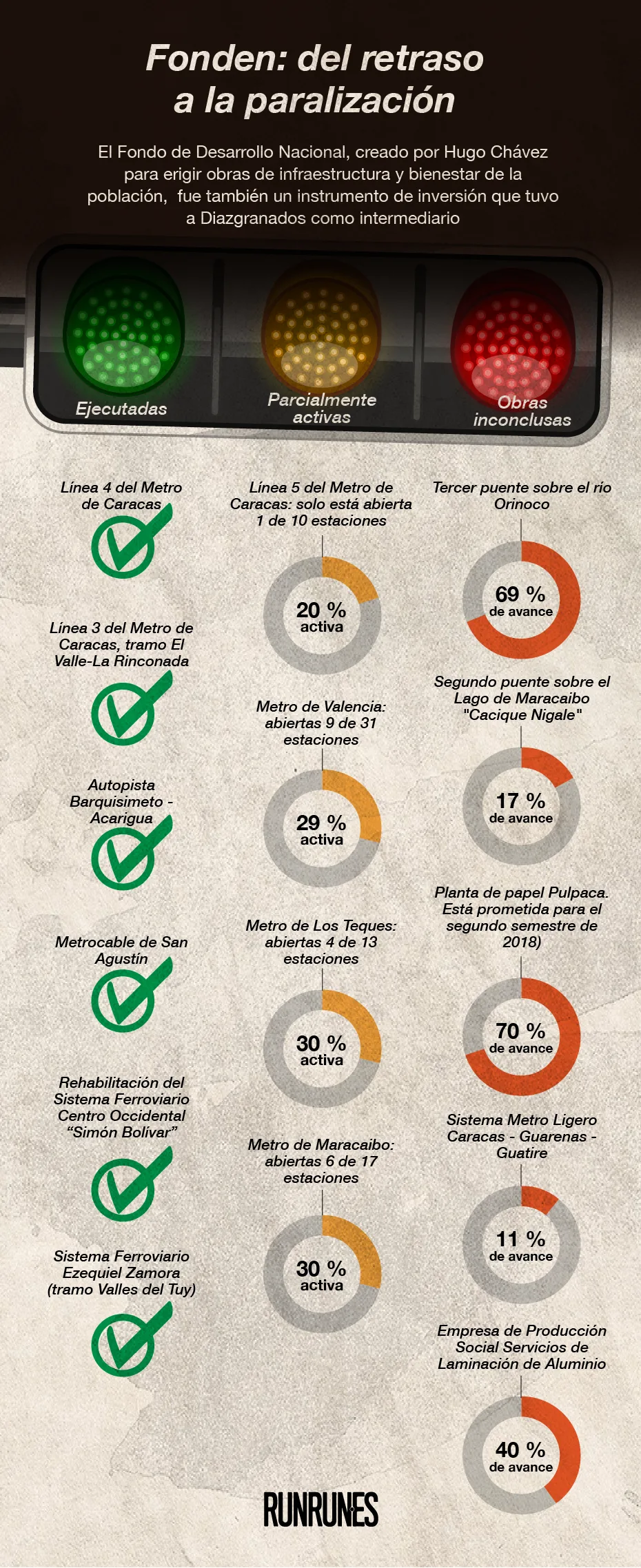 Del Fonden salió el dinero para expandir la Misión Alimentación que intentó contener, a través de las importaciones de productos, el desabastecimiento que ya se veía en 2013; así como para la construcción de las líneas 4 y 5 (aún sin terminar) del Metro de Caracas, las estaciones hoy activas del Metro de Valencia, Los Teques y Maracaibo, el Sistema Ferroviario Ezequiel Zamora (tramo Valles del Tuy), la rehabilitación del Sistema Ferroviario Centro Occidental “Simón Bolívar”, la autopista Barquisimeto – Acarigua, el Metrocable de San Agustín, la planta de papel Pulpaca; también se financiaron trabajos que todavía hoy no se han culminado como el tercer puente sobre el río Orinoco y el Sistema Metro Ligero Caracas – Guarenas – Guatire.