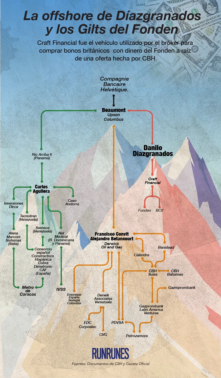 Los documentos a los que se tuvo acceso evidencian que montañas de dinero relacionado con el chavismo se apilaron en Suiza. Las actividades financieras de estos grupos de poder están relacionadas, en su mayoría, con Petróleos de Venezuela, Corpoelec y la Corporación Venezolana de Guayana; también con fondos públicos creados originalmente por Chávez para el desarrollo del país y con áreas estratégicas como la importación de medicinas e insumos hospitalarios.