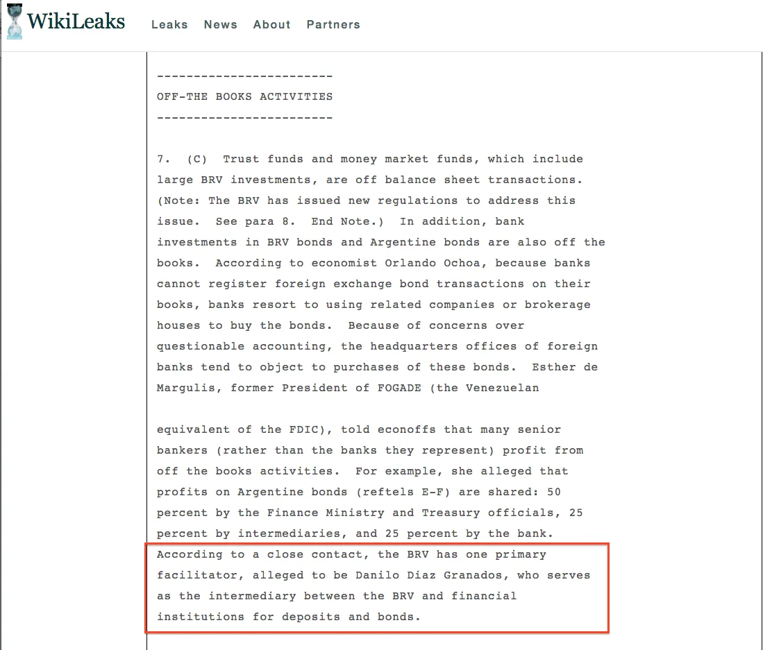 De acuerdo con el documento, que se conoció a través de la filtración Wikileaks, el alto diplomático norteamericano Kevin Whitaker, quien en ese momento estaba en Venezuela, afirmó que un contacto le había asegurado que Díazgranados era “el intermediario” entre el gobierno de Hugo Chávez y los bancos de inversión extranjeros para los “depósitos y bonos de deuda (tanto de Argentina como de Venezuela)” que estaban fuera de los balances oficiales (off the books activities). Es decir, de operaciones que no dejaban rastro o documentos registrados pese a que se hacían con dinero público.