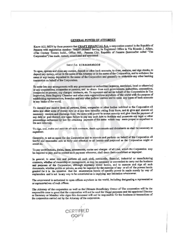 Un documento obtenido por esta investigación reveló que Díazgranados tenía un poder firmado por un abogado para hacer cualquier movimiento a través de Craft Financial a pesar de que no aparecía como miembro de la junta directiva. El escrito permite que el bróker realice amplias actividades financieras a nombre de empresa, como por ejemplo, acordar contratos con gobiernos, compañías y personas. Al final, aparece la rúbrica de todos los miembros de la compañía registrada en Panamá.