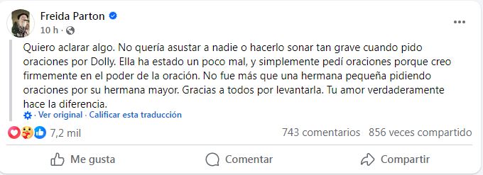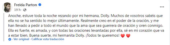 CompartirLa hermana de la artista estadounidense, Freida, aseguró que cree firmemente en el poder de la oración y pidió a los fans de la cantante rezar por ella y por su pronta recuperación La preocupación por el estado de salud de la cantante de country estadounidense Dolly Parton, que en los últimos días ha cancelado o pospuesto varios actos, llevó a una de sus hermanas, Freida, a pedir que se rece por ella. «Anoche estuve despierta toda la noche rezando por mi hermana Dolly. Muchos de ustedes saben que no se ha sentido muy bien últimamente. Creo firmemente en el poder de la oración, y esto me ha inspirado a pedir a todos los que la aman que sean guerreros de oración y recen conmigo», señaló el martes en Facebook. La también compositora «es fuerte, es querida y con todos los rezos dirigidos hacia ella» su hermana dijo estar segura de que va a estar bien. Entre los casi 3.900 comentarios que recibió esa publicación en sus primeras 13 horas hubo quien llegó a ofrecer a Dolly Parton su riñón «o cualquier otro órgano que se pueda donar, sin exageraciones». La ola de apoyo llevó después a la hermana a matizar sus palabras para no alarmar a la gente. «Quiero aclarar algo. No quise asustar a nadie ni hacer que sonara tan serio cuando pedí rezar por Dolly. Ella ha estado un poco indispuesta y simplemente pedí oraciones porque creo firmemente en el poder de la oración», dijo Freida este miércoles. Su primer mensaje, según añadió, «no fue más que una hermana pequeña pidiendo que se rece por su hermana mayor». «Gracias a todos por llevarla en sus oraciones. Su amor realmente marca la diferencia», concluyó. A finales de septiembre la cantante, de 79 años, anunció que pospondrá hasta septiembre de 2026 los seis conciertos que tenía previsto ofrecer en Las Vegas en diciembre de este año debido a problemas de salud que no especificó. «Como muchos saben, he afrontado algunos problemas de salud y mis médicos me dicen que debo someterme a algunos procedimientos», explicó en un comunicado publicado en X. ❤️ pic.twitter.com/D332AVLYnm — Dolly Parton (@DollyParton) September 28, 2025 Parton señaló que los tratamientos le impedirán ensayar y preparar su espectáculo: «Ustedes pagan un buen dinero para verme actuar y quiero estar en mi mejor momento para ustedes». Los problemas de salud van a hacer también que este próximo 16 de noviembre no vaya a poder asistir a la ceremonia de los premios Governors Awards de la Academia de Hollywodd, donde será homenajeada con un Oscar honorífico, según indicó a finales de septiembre el medio especializado The Hollywood Reporter. Cuando la autora de canciones como «Jolene», «Here You Came Again» o «Islands in The Stream» anunció que iba a posponer sus conciertos descartó que ese aplazamiento suponga una retirada de los escenarios: «Solo necesito un poco de tiempo para estar lista para el show (…) y para mayores aventuras junto a todos ustedes», dijo entonces. A petición de nuestra audiencia todos los anuncios publicitarios fueron removidos Navegación de entradas «El extraordinario viaje del dragón», un largometraje documental representará a Venezuela en el Goya