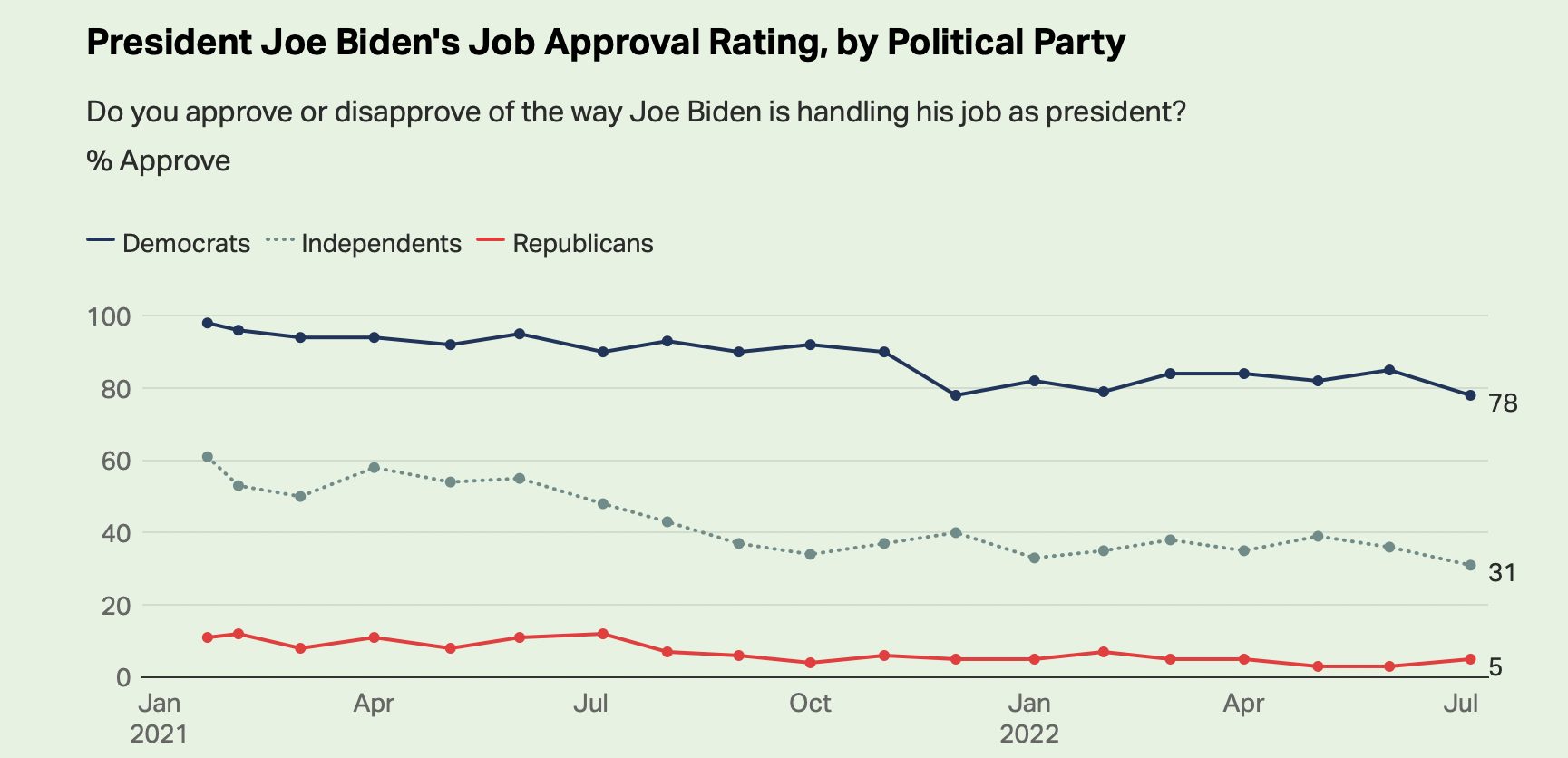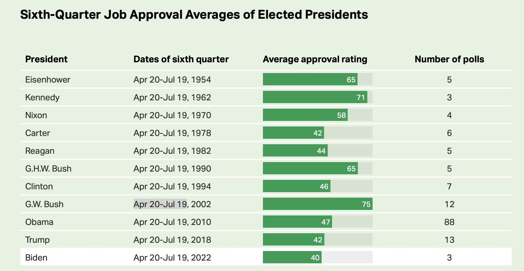 CompartirEl índice de aprobación promedio del presidente Joe Biden durante el sexto trimestre de su presidencia es el más bajo para cualquier persona elegida para el cargo, informó Gallup el viernes. Eso es según los datos recopilados por la encuestadora que datan de abril de 1954, cuando Dwight Eisenhower estaba en su primer mandato. Por Kipp Jones El índice de aprobación promedio de Biden del 20 de abril al 19 de julio fue del 40%, más bajo que los expresidentes Jimmy Carter y Donald Trump , quienes obtuvieron un 42% en el mismo punto en sus respectivos mandatos. El 75% del expresidente George W. Bush de abril a julio de 2002 sigue siendo el índice de aprobación promedio más alto del sexto trimestre que Gallup haya registrado. El promedio del sexto trimestre de Biden fue el “más bajo para un presidente electo”, dijo Gallup, y agregó: Durante este tiempo, un promedio del 40% de los estadounidenses aprobaron el trabajo que estaba haciendo como presidente. Ningún presidente elegido para su primer mandato ha tenido un promedio más bajo en el sexto trimestre que Biden, aunque las calificaciones de Jimmy Carter y Donald Trump fueron solo ligeramente mejores, con un 42 %. Barack Obama , Bill Clinton y Ronald Reagan también promediaron por debajo de la aprobación de la mayoría. Gallup también señaló que el índice de desaprobación actual de Biden es del 59% entre todos los votantes, que es un nuevo récord para el presidente. Su apoyo entre los votantes independientes también se encuentra en un nuevo mínimo del 31 %, mientras que empató su mínimo histórico con los demócratas en un 78 %. El apoyo al presidente entre los republicanos aumentó levemente del 3% en junio al 5% este mes. Jeffrey Jones de Gallup señaló: Biden se ha enfrentado a una serie de desafíos como presidente, y los estadounidenses en general han calificado mal su trabajo durante el último año, con un índice de aprobación promedio como presidente ahora del 46%. Actualmente, su apoyo público es el más bajo hasta la fecha. Los demócratas ya se enfrentaban a un entorno difícil en las elecciones intermedias de este otoño, ya que buscan retener sus estrechas mayorías en la Cámara de Representantes y el Senado de EE. UU. La aprobación ahora más débil de Biden hace que sus probabilidades de hacerlo sean aún más altas. Gallup encuestó a 1013 estadounidenses del 5 al 26 de julio. La encuesta informó un margen de error de +/- 4 puntos. A petición de nuestra audiencia todos los anuncios publicitarios fueron removidos Navegación de entradas ONU y el Foro Económico Mundial detrás de la ‘guerra contra los agricultores’ global: expertos Carlos Sein Atachahua Espinoza acusado de blanqueo masivo para narcos