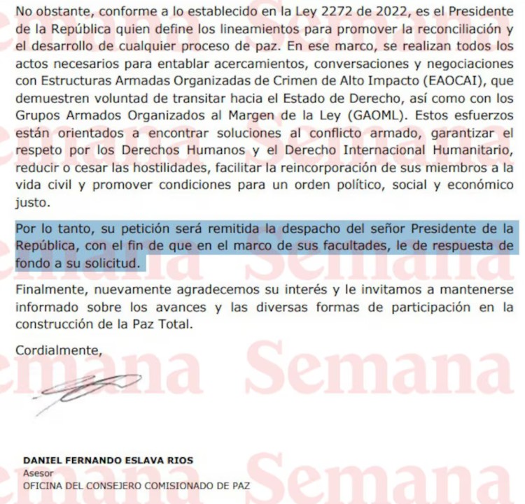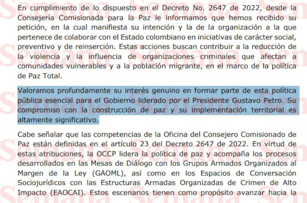 CompartirLa que podría ser la negociación más espinosa y polémica en el marco de la ‘paz total’ que ha planteado el gobierno del presidente Gustavo Petro, avanza en voz baja. Se trata de la solicitud de diálogos con la organización terrorista transnacional del Tren de Aragua, que, desde hace casi un mes, pidió pista. Por semana.com Esta solicitud, revelada por SEMANA, fue respondida por la Oficina swl Consejero Comisionado de Paz, quien no cerró las puertas, por el contrario, dejó en las manos del mentor de la ‘paz total’, el presidente Gustavo Petro, no sin antes destacar la solicitud. La petición de entrar a la negociación la hizo directamente Larry Amaury Álvarez, uno de los tres fundadores de la organización criminal, quien incluso, estuvo detenido, al lado de Niño Guerrero ?fundador del Tren de Aragua?, en la cárcel de Tocorón, en Venezuela, que se convirtió en su base de operaciones criminales mientras se extendían por el continente, todo con la venia del régimen de Nicolás Maduro. La respuesta de la Oficina del Consejero Comisionado de Paz, encabezada por el comisionado Otty Patiño, sorprendió por la amabilidad de la respuesta, cuando, hace pocos días, el exministro de Eduardo Montealegre ?quien tuvo un paso fugaz por esta cartera? la había rechazado de entrada. Señala la respuesta del comisionado: “Valoramos profundamente su interés genuino en formar parte de esta política pública esencial para el gobierno liderado por el presidente Gustavo Petro. Su compromiso con la construcción de paz y su implementación territorial es altamente significativo”. Sin embargo, en el documento, firmado Daniel Fernando Eslava, como “asesor” de la Oficina del Consejero Comisionado de Paz, plantea que normativamente la última palabra la dictará el presidente Gustavo Petro. El Tren de Aragua busca entrar la paz total del presidente Gustavo Petro. | Foto: SEMANA / AP “Conforme a lo establecido en la Ley 2272 de 2022, es el presidente de la República quien define los lineamientos para promover la reconciliación y el desarrollo de cualquier proceso de paz. En ese marco, se realizan todos los actos necesarios para entablar acercamientos, conversaciones y negociaciones con Estructuras Armadas Organizadas de Crimen de Alto Impacto (EAOCAI), que demuestren voluntad de transitar hacia el Estado de derecho, así como con los Grupos Armados Organizados al Margen de la Ley (GAOML)”, argumenta la respuesta que inmediatamente deja sobre la mesa del presidente la decisión. “Por lo tanto, su petición será remitida la despacho del señor presidente de la República, con el fin de, que en el marco de sus facultades, le dé respuesta de fondo a su solicitud”, advierte la respuesta. Para leer la nota completa pulse Aquí A petición de nuestra audiencia todos los anuncios publicitarios fueron removidos Navegación de entradas La historia que une a un abogado, su cliente, un secuestro y 9 millones de dólares El portaaviones USS Gerald Ford está oficialmente en el Atlántico tras cruzar el estrecho de Gibraltar