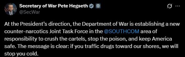 CompartirEl secretario de Guerra de Estados Unidos, Pete Hegseth, anunció este viernes 10 de octubre la creación de una nueva Fuerza de Tarea Conjunta antinarcóticos que operará en el área de responsabilidad del Comando Sur. A través de su cuenta en la red social X, Hegseth declaró que la misión de esta nueva unidad es «aplastar a los cárteles, detener el veneno y mantener la seguridad de Estados Unidos». El jefe del Pentágono emitió una advertencia directa a los grupos de narcotráfico que operan en la región. «El mensaje es claro: si trafican drogas hacia nuestras costas, los detendremos en seco», sentenció. La creación de esta fuerza de tarea da un marco oficial a las operaciones militares que se han intensificado en la región durante la última semana. Estas han incluido el despliegue de una flota naval liderada por el grupo anfibio Iwo Jima, aviones de combate, drones de ataque y unidades de operaciones especiales, así como ataques letales a narcolanchas. Esta acción es coherente con la notificación enviada por la Casa Blanca al Congreso, en la que se declaró un «conflicto armado no internacional» contra los carteles. El régimen venezolano, por su parte, ha denunciado que estas operaciones son un pretexto para una agresión militar en su contra y ha respondido con la activación de planes de defensa. A petición de nuestra audiencia todos los anuncios publicitarios fueron removidos Navegación de entradas Premio Nobel de la Paz para María Corina Machado llega en el peor momento posible para el régimen de Nicolás Maduro «Es un faro de esperanza»: Venezolanos en EEUU celebraron Nobel de la Paz para María Corina Machado