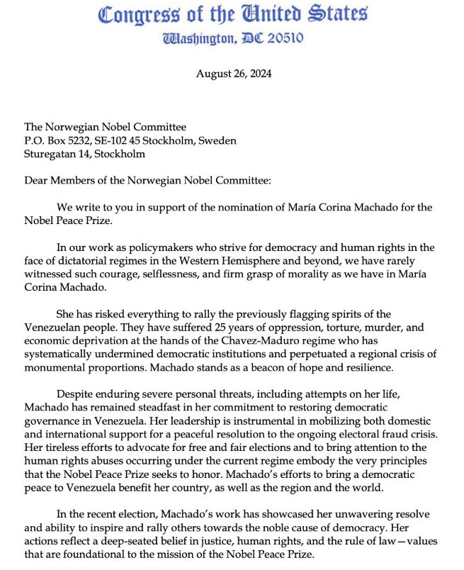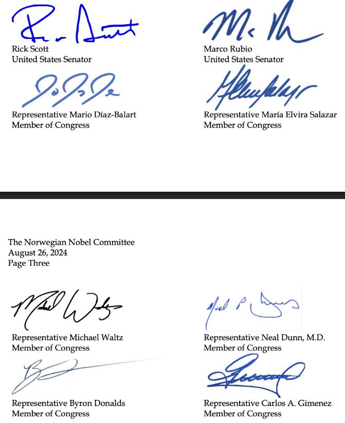 CompartirEl secretario de Estado, Marco Rubio, encabezó en agosto del año pasado la lista de diplomáticos, senadores y congresistas de Estados Unidos que nominaron a la líder democrática venezolana, María Corina Machado, al Premio Nobel de la Paz 2025, galardón que se adjudicó este viernes. Además de Rubio, el embajador ante las Naciones Unidas de EEUU, Mike Waltz, también promovió la candidatura de Machado. Otros solicitantes fueron los congresistas María Elvira Salazar, Mario Díaz-Balart, Neal Dunn, Byron Donalds, Carlos Giménez, y el senador Rick Scott. Los firmantes afirmaron entonces en la carta enviada al Comité Nobel que «pocas veces hemos presenciado tanto coraje, altruismo y firme comprensión de la moral como en María Corina Machado». A petición de nuestra audiencia todos los anuncios publicitarios fueron removidos Navegación de entradas FOTOS: Avistaron por primera vez desde tierra el sobrevuelo de un P-8 Poseidon de EEUU cerca de costas venezolanas Venezolanos oran a sus próximos dos primeros santos por la libertad de presos políticos