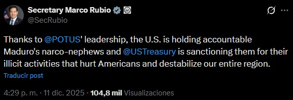 CompartirEl secretario de Estado de los Estados Unidos, Marco Rubio, emitió un pronunciamiento este jueves 11 de diciembre celebrando la nueva ronda de sanciones impuestas por el Departamento del Tesoro contra el círculo familiar cercano de Nicolás Maduro. A través de una declaración pública, el alto funcionario destacó que estas medidas son una consecuencia directa de las actividades criminales que operan desde Venezuela. «Gracias al liderazgo del presidente, Estados Unidos está responsabilizando a los narcosobrinos de Maduro», afirmó Rubio, refiriéndose explícitamente a Efraín Antonio Campo Flores, Franqui Francisco Flores de Freitas y Erick Malpica Flores, quienes volvieron a ser incluidos en la lista negra de la OFAC tras haber sido indultados en 2022. Rubio justificó la ofensiva económica y legal señalando el impacto directo de estas operaciones en la población norteamericana y en el equilibrio geopolítico del hemisferio. Según el funcionario, el Departamento del Tesoro está actuando contra estos individuos «por sus actividades ilícitas que perjudican a los estadounidenses y desestabilizan a toda nuestra región». La declaración de Rubio se alinea con la postura de «máxima presión» retomada por la Casa Blanca, que vincula al entorno de Maduro con redes de narcotráfico y corrupción transnacional que amenazan la seguridad del continente. A petición de nuestra audiencia todos los anuncios publicitarios fueron removidos Navegación de entradas EEUU sanciona a toda la familia de Nicolás Maduro y a seis navieras petroleras “¡Tenemos control total!”: Carlos Gimenez lanzó nueva advertencia para forzar la salida de Nicolás Maduro