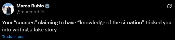 CompartirEl secretario de Estado de Estados Unidos, Marco Rubio, desmintió este viernes 31 de octubre un artículo publicado por el Miami Herald. El reporte de prensa afirmaba que Estados Unidos se prepara para atacar objetivos militares en Venezuela, en lo que el medio describió como «una escalada contra el régimen de Nicolás Maduro». A través de su cuenta en la red social X, el secretario de Estado refutó la información y cuestionó la veracidad de las fuentes consultadas por el periódico. «Tus ‘fuentes’, que afirmaban tener ‘conocimiento de la situación’, te engañaron para que escribieras una historia falsa», puntualizó. A petición de nuestra audiencia todos los anuncios publicitarios fueron removidos Navegación de entradas EEUU tiene capacidad en el Caribe para «ataques inmediatos» contra Venezuela, según informe