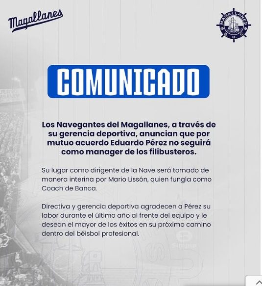Los Navegantes del Magallanes anunciaron este jueves a través de un comunicado la desvinculación de Eduardo Pérez como mánager del equipo “por mutuo acuerdo”, debido a su mal arranque en la presente temporada de la Liga Venezolana de Béisbol Profesional (Lvbp).