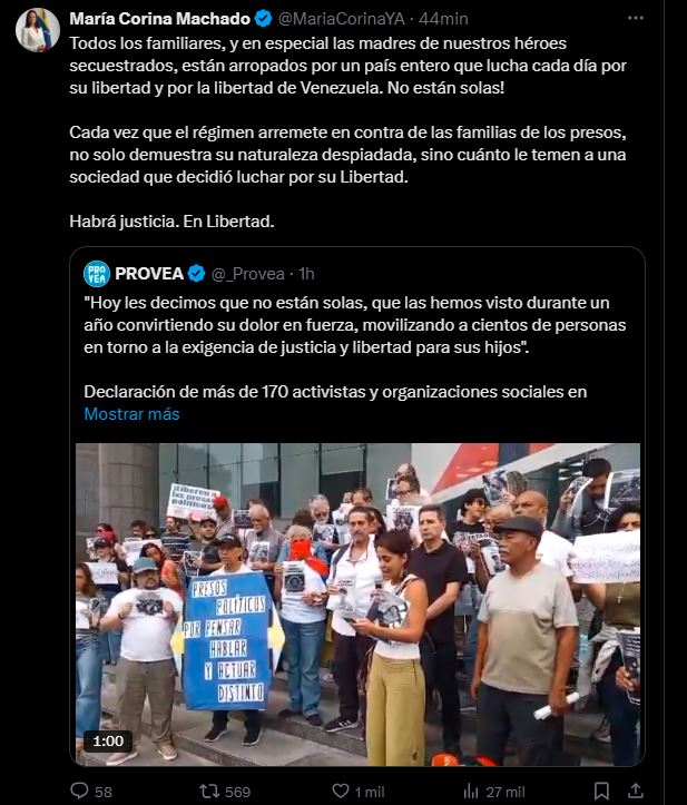 CompartirLa líder opositora venezolana María Corina Machado envió un mensaje de respaldo a las madres y familiares de los llamados “héroes secuestrados”, en alusión a los presos políticos en Venezuela. En su cuenta oficial de X, ante Twitter, María Corina Machado aseguró: “Todos los familiares, y en especial las madres de nuestros héroes secuestrados, están arropados por un país entero que lucha cada día por su libertad y por la libertad de Venezuela. ¡No están solas!” Su mensaje surgió como respuesta a una publicación de la organización de derechos humanos Provea, que este mismo viernes 8 de agosto, compartió un pronunciamiento firmado por más de 170 activistas y organizaciones sociales. En su mensaje, Provea manifestó: “Hoy les decimos que no están solas, que las hemos visto durante un año convirtiendo su dolor en fuerza, movilizando a cientos de personas en torno a la exigencia de justicia y libertad para sus hijos”. Este pronunciamiento se enmarca en la campaña #LuchaComoUnaMadre, tras las agresiones que sufrieron varias madres de presos políticos a manos de presuntos paramilitares el pasado martes 5 de agosto, frente a la sede del Tribunal Supremo de Justicia (TSJ) en Caracas. María Corina Machado también señaló que cada vez que el régimen chavista arremete contra las familias de los presos políticos, “no solo demuestra su naturaleza despiadada, sino cuánto le temen a una sociedad que decidió luchar por su libertad”. La dirigente de Vente Venezuela, cerró su mensaje con una frase que encapsula su postura política en pro de la transición a la democracia: “Habrá justicia. En Libertad”. A petición de nuestra audiencia todos los anuncios publicitarios fueron removidos Navegación de entradas Trump ordena al Ejército que Apunte a Carteles de Drogas Extranjeros Exministro colombiano advirtió que Maduro busca expandir el socialismo con el Tren de Aragua