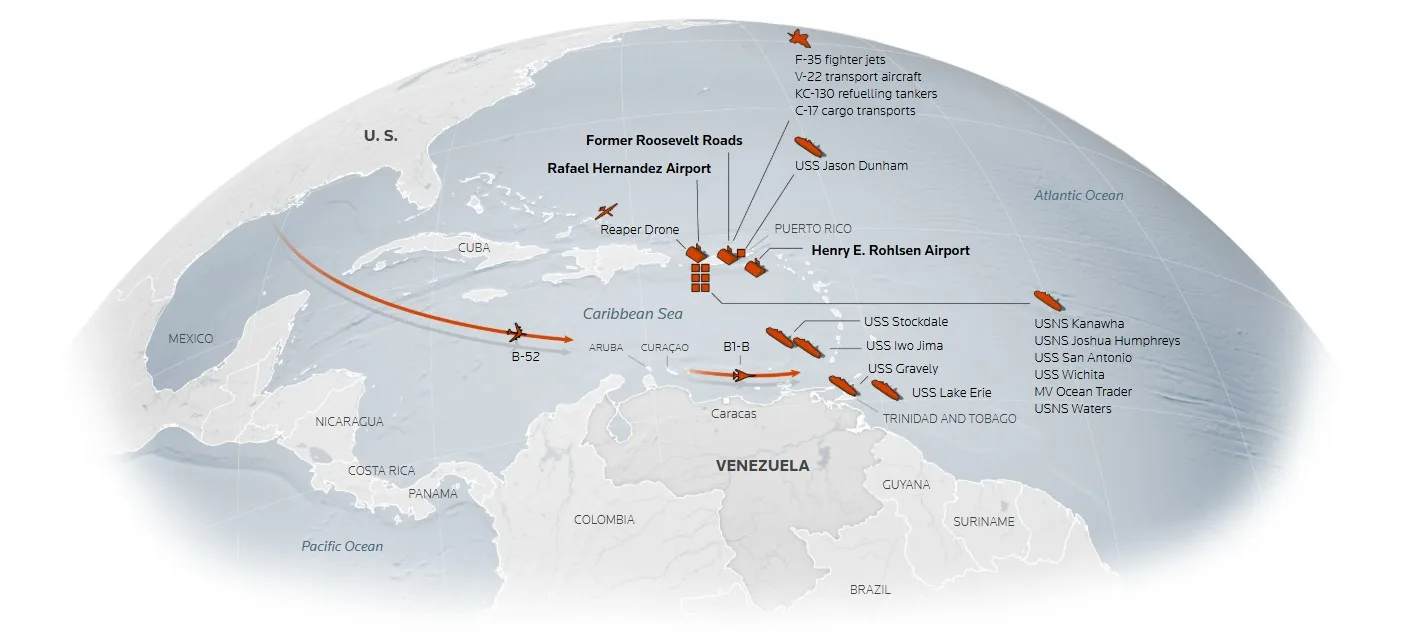 CompartirEl ejército estadounidense está modernizando una antigua base naval de la Guerra Fría, abandonada hace mucho tiempo en el Caribe, según una investigación visual de Reuters. Esto sugiere preparativos para operaciones sostenidas que podrían apoyar posibles acciones dentro de Venezuela. Por reuters.com Las obras en la antigua base naval Roosevelt Roads en Puerto Rico —cerrada por la Armada hace más de 20 años— comenzaron el 17 de septiembre, cuando las cuadrillas iniciaron la limpieza y repavimentación de las calles de rodaje que conducen a la pista, según fotografías tomadas por Reuters. Hasta que la Armada se retiró de las instalaciones en 2004, Roosevelt Roads fue una de las bases navales estadounidenses más grandes del mundo. La base ocupa una ubicación estratégica y ofrece un amplio espacio para el almacenamiento de equipo, según declaró un funcionario estadounidense. Además de las mejoras en las capacidades de aterrizaje y despegue en Roosevelt Roads, Estados Unidos está construyendo instalaciones en aeropuertos civiles en Puerto Rico y St. Croix, en las Islas Vírgenes de los Estados Unidos. Los dos territorios estadounidenses se encuentran a unos 800 kilómetros de Venezuela. Reuters habló con tres oficiales militares estadounidenses y tres expertos marítimos, quienes afirmaron que las nuevas construcciones en Puerto Rico y las Islas Vírgenes apuntan a preparativos que podrían permitir al ejército estadounidense realizar operaciones dentro de Venezuela. El presidente venezolano, Nicolás Maduro, ha alegado repetidamente que Estados Unidos busca derrocarlo. “Creo que todo esto está diseñado para atemorizar al régimen de Maduro y a los generales que lo rodean, con la esperanza de crear divisiones”, declaró a Reuters Christopher Hernández-Roy, investigador principal del Centro de Estudios Estratégicos e Internacionales (CSIS) en Washington. Para monitorear la actividad militar estadounidense en la región durante los últimos dos meses, Reuters fotografió bases militares estadounidenses y revisó imágenes satelitales, datos de seguimiento de barcos y vuelos, y publicaciones en redes sociales. La agencia de noticias también rastreó los movimientos de buques militares estadounidenses mediante reportajes sobre el terreno y fotografías y videos de acceso público. El despliegue militar en la región es el mayor no relacionado con ayuda humanitaria desde 1994, cuando Estados Unidos envió dos portaaviones y más de 20.000 soldados a Haití para participar en la “Operación Apoyo a la Democracia”. Desde principios de septiembre, Estados Unidos ha llevado a cabo al menos 14 ataques contra presuntos buques de narcotráfico en el Caribe y el Pacífico, con un saldo de 61 muertos. Los ataques contra presuntos buques de narcotráfico han incrementado las tensiones con Venezuela y Colombia y han puesto de relieve una región del mundo que ha recibido recursos limitados por parte del ejército estadounidense en los últimos años. Al ser consultada sobre la expansión militar en la región, la Casa Blanca declaró que el presidente Donald Trump había prometido durante su campaña electoral combatir a los cárteles de la droga de la región. “Ha tomado medidas sin precedentes para detener el flagelo del narcoterrorismo que ha provocado la muerte innecesaria de estadounidenses inocentes”, declaró la portavoz de la Casa Blanca, Anna Kelly, en un comunicado a Reuters. El despliegue militar estadounidense en el Caribe comenzó en agosto con la llegada de buques de guerra, un submarino nuclear, aviones de combate y aeronaves de reconocimiento. El grupo de ataque del portaaviones Ford, con aproximadamente 10.000 efectivos y decenas de aeronaves y sistemas de armas, se dirige desde el mar Adriático. Uno de los destructores del Ford zarpó de Gibraltar el 29 de octubre, según imágenes satelitales y datos de seguimiento de buques. Ante los hallazgos de Reuters, el Pentágono no respondió a la solicitud de comentarios. El gobernador de Puerto Rico tampoco respondió a la solicitud de comentarios. Desarrollo de bases en el Caribe Algunas de las mejoras de infraestructura más importantes se están llevando a cabo en la antigua base de Roosevelt Roads, donde se están modernizando las pistas de rodaje con mejoras que, según los analistas, permitirán su uso tanto por aviones de combate como de carga. Mark Cancian, coronel retirado del Cuerpo de Marines de EE. UU. y asesor principal del CSIS, afirmó que estos cambios se ajustan a los preparativos para un aumento en los aterrizajes y despegues de aeronaves militares. Imágenes satelitales muestran mejoras recientes en una calle de rodaje en el extremo norte de la antigua base militar Roosevelt Roads en Ceiba, Puerto Rico. Fuentes: Google Earth / Airbus, Planet Labs PBC Además de las obras de renovación de la calle de rodaje, Reuters observó la instalación de equipos portátiles de apoyo al tráfico aéreo y otros equipos móviles de seguridad. Imágenes satelitales tomadas el 29 de octubre muestran 20 nuevas tiendas de campaña al sureste de la pista, cerca de un hangar de aviones abandonado. Aeronaves y helicópteros del Cuerpo de Marines y la Fuerza Aérea de Estados Unidos se encuentran estacionados en la antigua base militar Roosevelt Roads en Ceiba, Puerto Rico, el 30 de septiembre de 2025. REUTERS/Ricardo Arduengo Hernández-Roy, investigador del CSIS, declaró a Reuters que era posible que el ejército estadounidense simplemente estuviera reparando baches. Pero añadió: «Si ahora su atención se centra en el hemisferio occidental, tiene todo el sentido que quieran reabrir lo que antes era una enorme base naval y asegurarse de que pueda albergar la variedad de aeronaves que utiliza el ejército estadounidense». Tiendas de campaña instaladas cerca de la pista de aterrizaje en la antigua Estación Naval de Roosevelt Roads, 29 de octubre de 2025. Fuentes: Planet Labs PBC, REUTERS/Ricar