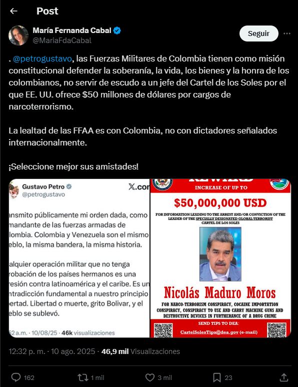 CompartirLa senadora colombiana María Fernanda Cabal respondió de forma contundente al presidente Gustavo Petro, luego de que este manifestara su rechazo a un operativo militar aprobado por el mandatario estadounidense, Donald Trump, para combatir a grupos narcoterroristas en Latinoamérica, entre ellos el Cártel de los Soles, que las autoridades de Estados Unidos vinculan directamente con Nicolás Maduro y altos funcionarios del régimen chavista. En un mensaje publicado en la red social X, María Fernanda Cabal recordó que la misión constitucional de las Fuerzas Militares de Colombia es “defender la soberanía, la vida, los bienes y la honra de los colombianos”, no servir de escudo a “un jefe del Cartel de los Soles” por el que EEUU ofrece una recompensa de 50 millones de dólares por cargos de narcoterrorismo. “La lealtad de las FFAA es con Colombia, no con dictadores señalados internacionalmente. ¡Seleccione mejor sus amistades!”, sentenció la congresista. La reacción de Cabal se produjo después de que Petro publicara un mensaje en el que señalaba que Colombia y Venezuela son el mismo pueblo y que cualquier operación militar que no tenga consenso con los países de la región “es un acto contrario a la hermandad latinoamericana y caribeña”. El Cártel de los Soles ha sido señalado por el Departamento de Justicia de Estados Unidos como una estructura criminal dedicada al tráfico de cocaína y otros delitos transnacionales, supuestamente liderada por Nicolás Maduro, Diosdado Cabello y Vladimir Padrino López. La acusación incluye cargos de conspiración para el narcoterrorismo, tráfico de drogas y uso de armas de guerra. Con este cruce de declaraciones, se profundiza el debate en Colombia sobre la política exterior del gobierno de Petro y su cercanía con el chavismo, en un contexto marcado por las acusaciones internacionales contra altos funcionarios venezolanos. A petición de nuestra audiencia todos los anuncios publicitarios fueron removidos Navegación de entradas “A cazar”: El mensaje que lanzó EEUU sobre su ofensiva militar contra el Cártel de los Soles (VIDEO) Al menos cinco calabozos policiales de Caracas negaron tener presa a Martha Lía Grajales (VIDEO)
