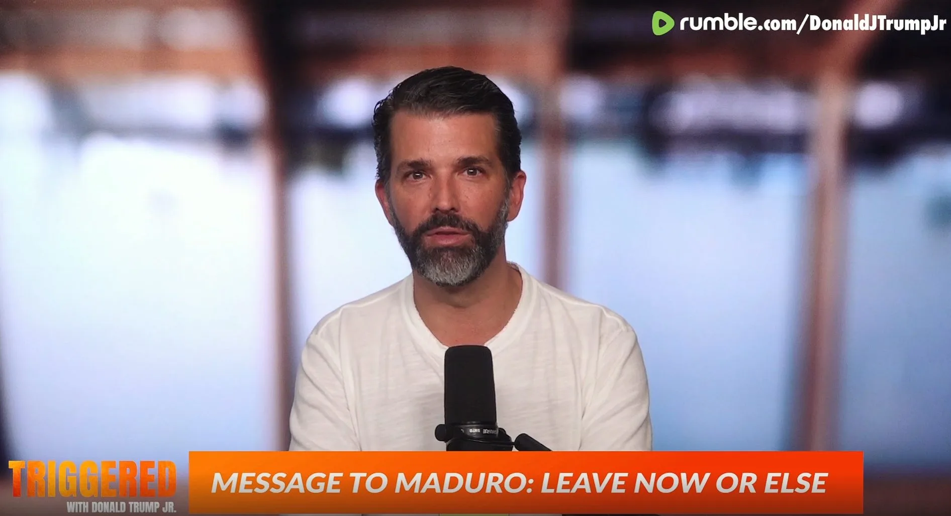 «Tenemos una amenaza real para nuestro hemisferio justo frente a nuestras costas, y los demócratas están tratando de sabotear nuestra capacidad para hacerle frente. Maduro, el líder del cártel, el líder y el tipo que fue aplastado en las elecciones del año pasado, ¿verdad? ¿Recuerdas cuando perdió contra Marica Corina Machado? No importó. Ya saben, ella era la principal candidata de la oposición. La bloquearon. ¿A quién le importa? Él se mantuvo en el poder. Ahora, mi padre le dio un ultimátum a Maduro: abandone Venezuela ahora o sucederá algo más’. Según se informa, Maduro dijo que se iría, pero solo si podía seguir controlando al ejército mientras estuviera en el exilio, lo cual no es exactamente como se supone que debe funcionar, amigos», comentó Trump Jr. en su podcast «Triggered» publicado en la red social Rumble.