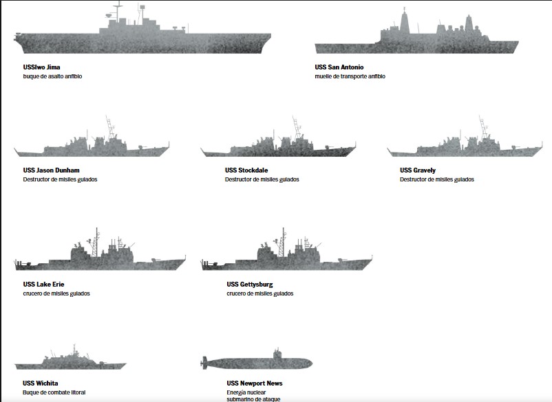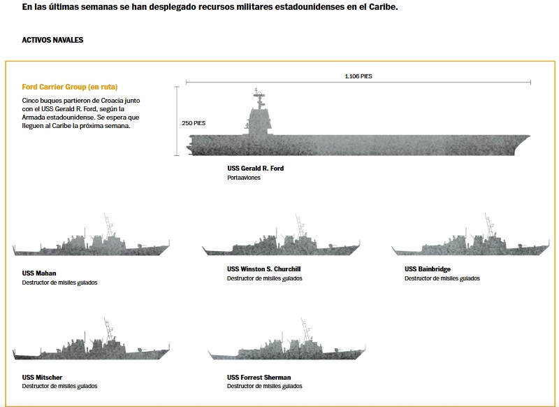 CompartirEl despliegue a gran escala de fuerzas y recursos militares estadounidenses en el Caribe sugiere que la administración Trump se está preparando para expandir las operaciones en la región, lo que aumenta las tensiones entre Washington y Caracas y eleva la posibilidad de los primeros ataques estadounidenses contra Venezuela. Por Por Júlia Ledury Susannah George | The Washington Post. Las fuerzas estadounidenses en el Caribe incluyen ocho buques de guerra de la Armada, un buque de operaciones especiales y un submarino de ataque de propulsión nuclear. Cuando el portaaviones USS Gerald R. Ford llegue al Caribe la próxima semana, traerá consigo tres buques de guerra más y más de 4000 soldados adicionales. Despliegues al 31 de octubre. El USS Fort Lauderdale había sido desplegado en el Caribe, pero abandonó la zona el 28 de octubre con destino a Florida. Fuentes: Marina de los EE. UU., Departamento de Guerra, FlightRadar. Despliegues al 31 de octubre. El USS Fort Lauderdale había sido desplegado en el Caribe, pero abandonó la zona el 28 de octubre con destino a Florida. Fuentes: Marina de los EE. UU., Departamento de Guerra, FlightRadar. Despliegues al 31 de octubre. El USS Fort Lauderdale había sido desplegado en el Caribe, pero abandonó la zona el 28 de octubre con destino a Florida. Fuentes: Marina de los EE. UU., Departamento de Guerra, FlightRadar. El presidente Donald Trump ha indicado que está planeando intensificar las operaciones contra el presidente venezolano Nicolás Maduro, pero cuando se le preguntó el viernes si estaba considerando ataques militares dentro de Venezuela, respondió “no”. El Pentágono ha reconocido haber llevado a cabo más de una docena de ataques contra supuestos barcos narcotraficantes, en los que han muerto al menos 61 personas desde septiembre. Desde el principio, el despliegue del Pentágono en el Caribe ha superado con creces lo necesario para una operación antinarcóticos, lo que sugiere que la misión siempre estuvo “preparada para evolucionar”, dijo Ryan Berg, director del Programa de las Américas y del Centro de Estudios Estratégicos e Internacionales. Pero Berg afirmó que la incorporación del grupo de ataque de portaaviones podría indicar que la expansión de las operaciones es inminente. «La competencia por estos buques es enorme», dijo, ya que solo tres están desplegados simultáneamente. Una vez que el Ford llegue al Caribe la próxima semana, «comenzará una cuenta regresiva y Trump tendrá aproximadamente un mes para tomar una decisión importante sobre un ataque antes de tener que trasladar» el buque a otro lugar. Personal militar estadounidense estimado desplegado en el Caribe En Washington, los legisladores demócratas afirman estar cada vez más frustrados por la falta de transparencia en torno a las operaciones.Icono de IA Los demócratas en el Congreso han acusado a la administración Trump de no haber compartido la justificación legal de los ataques. Para leer la nota completa ingrese AQUÍ A petición de nuestra audiencia todos los anuncios publicitarios fueron removidos Navegación de entradas El Pentágono enfoca ataques al narcotráfico en el Pacífico por este motivo The Guardian: Presión militar de Trump sobre Maduro evoca el pasado de América Latina plagado de golpes de Estado