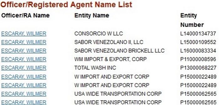 De manera independiente www.abcnoticias.net constató que Wilmer Escaray posee más de una decena de empresas en Estados Unidos, de las cuales se presume que pertenezcan a una red sofisticada de lavado de dinero tras proveer de comida gourmet a miembros del Cartel de los Soles.